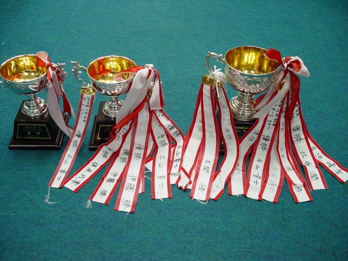 | 1996年からの歴代の 優勝者の名前入りの トロフィーカップ(右)船外 (中央)V艇用 |