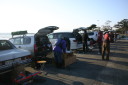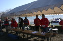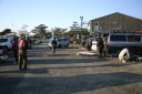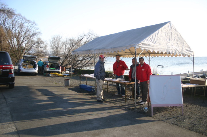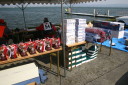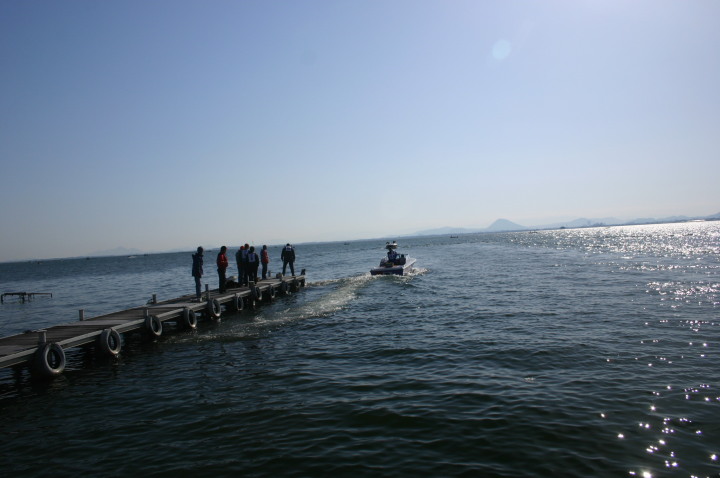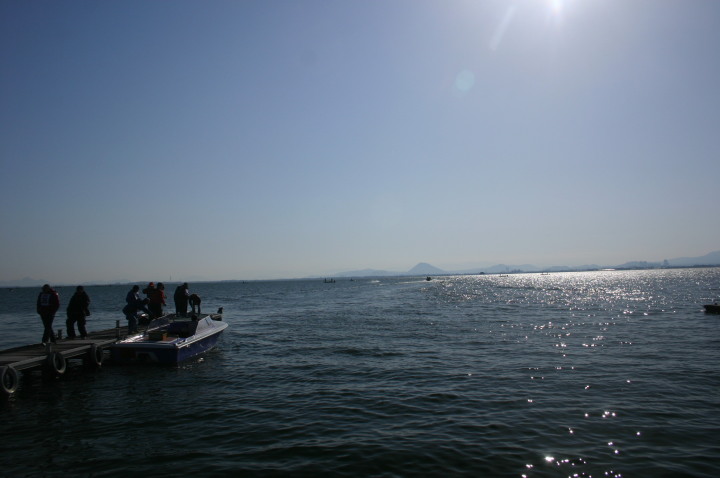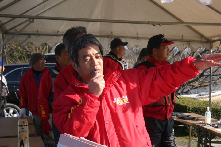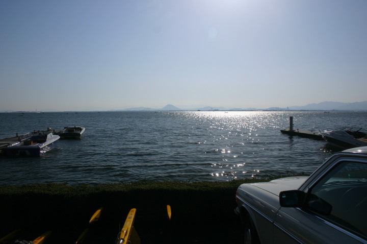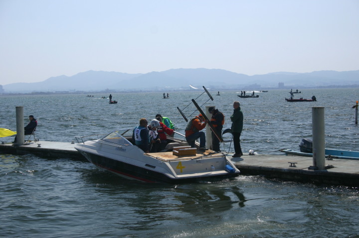 | 水原会長のご挨拶 | コースの説明 | KRTの役員さん朝5時起きで6時の開門の準備で皆様をお待ちしておられました。 | 当日朝の琵琶湖の水面。 | ここから出走します。 |