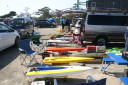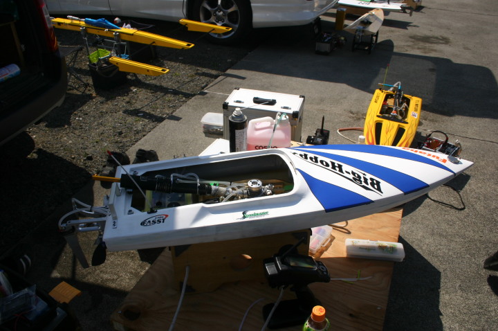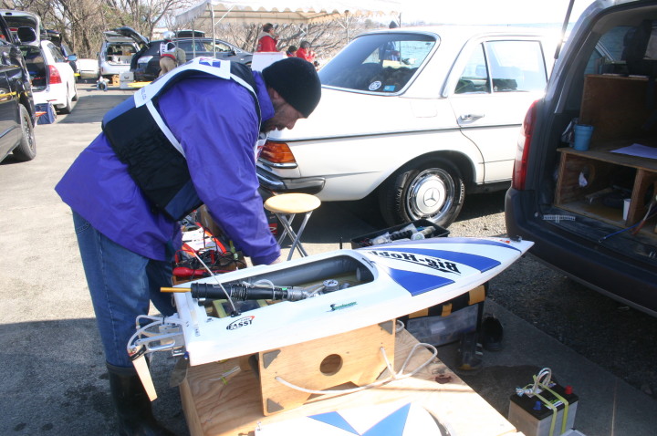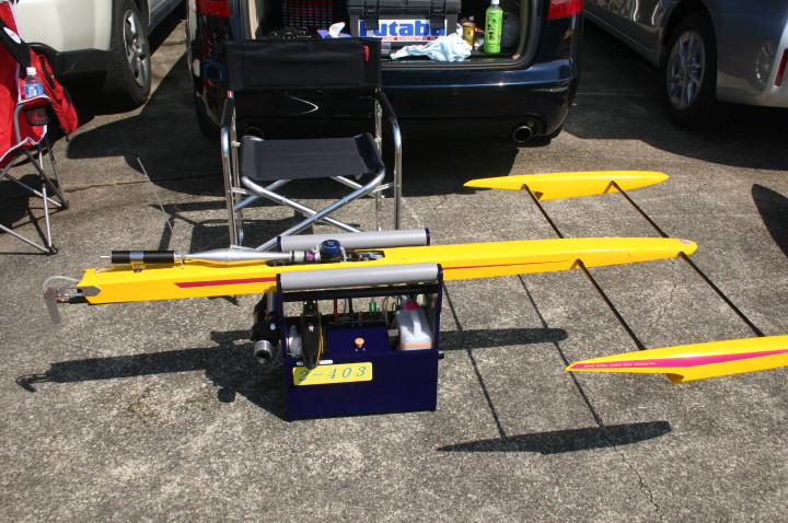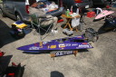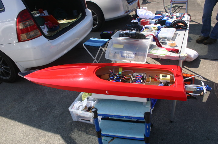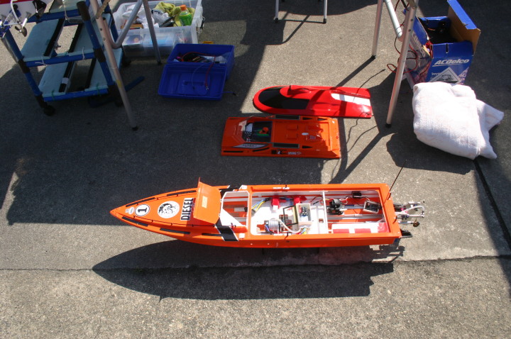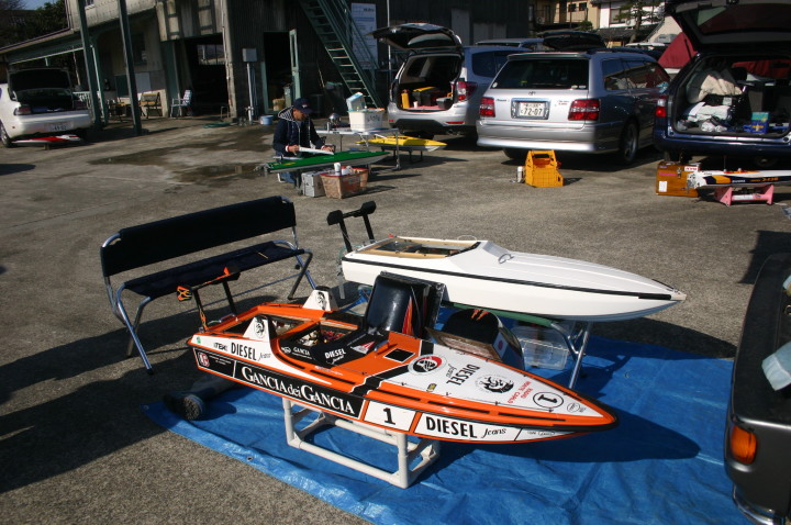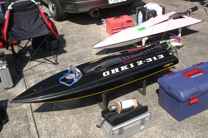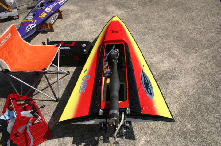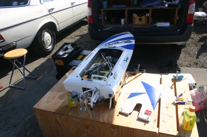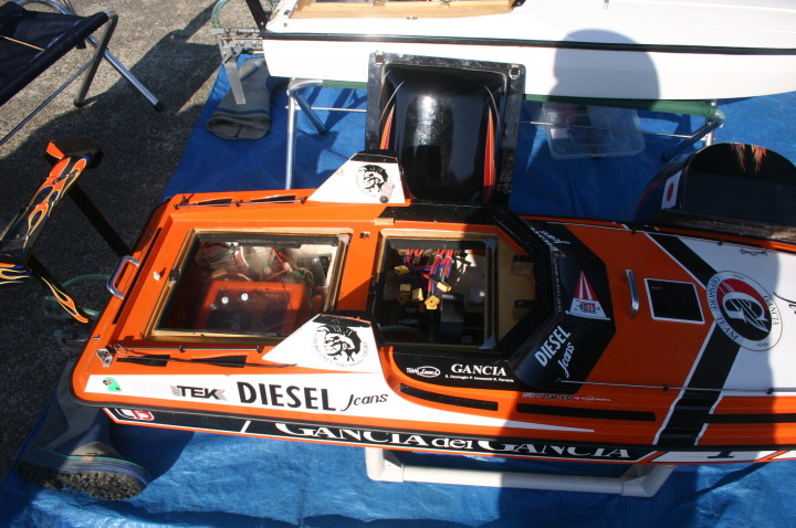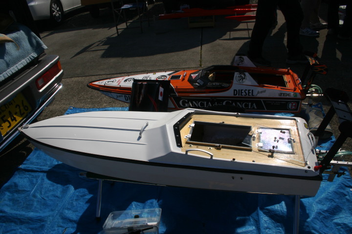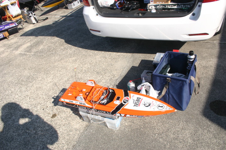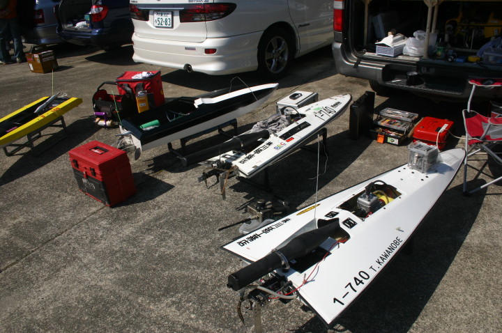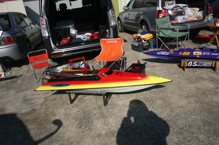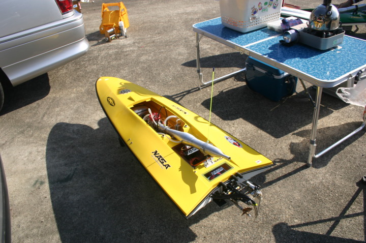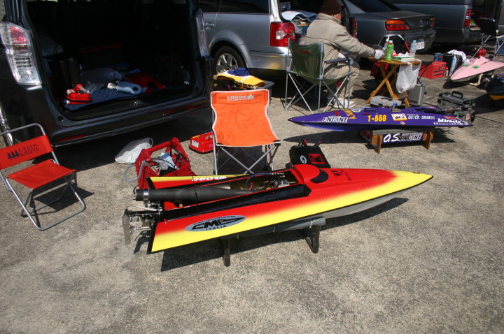 | 朝の開門と同時に全国から続々と集まって来る選手たち。 | エントリー受付の準備中。 | R級(21V)このクラスは今回初めて採用されました。延べ6艇が完走しました。この艇は2回とも完走しましたが成績は3位に10秒およばず4位になりました。 | 船体はAeromarine Chalenger43Pro 109mmスクリューユニットはSpeedmasterエンジンはNovarossi T21-7Mギアマウント仕様 | Novarossi T21-7MにTRK21ギアマウント |