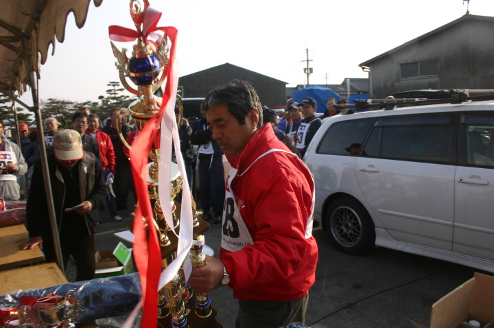 | 水原会長ベストラップ賞本日一番の大活躍でした。 | ゼッケント交換とTRKよりの参加賞を受け取る。 | ゼッケント交換とTRKよりの参加賞を受け取る。 | 全員集合! |