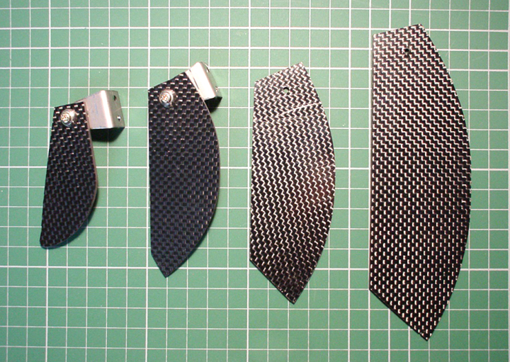 2mm厚カーボンモノ用ターンフイン | 15〜21用が2種類 21〜45用 45〜90用と4種類のターンフインを作りました。 |