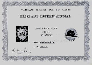 | Speed Car 世界大会の5ccクラスで338.2823Km/h でPicco Gualterangeloが優勝した表彰状(2007年) |