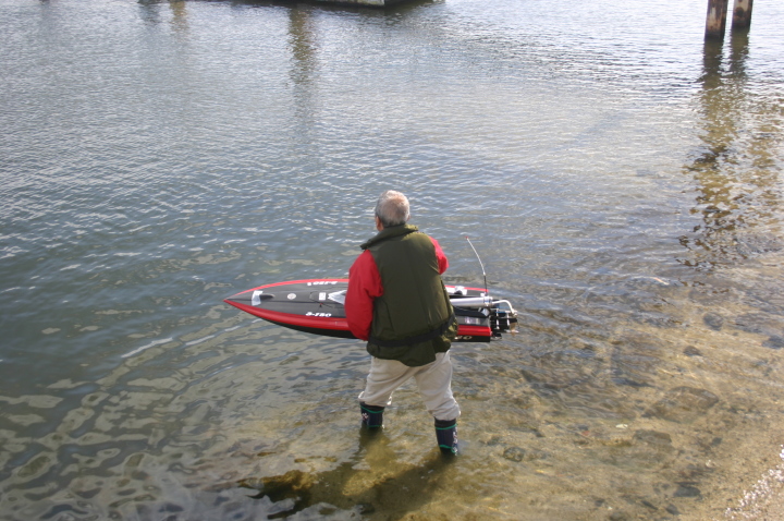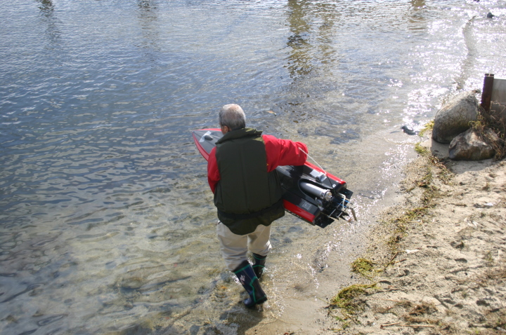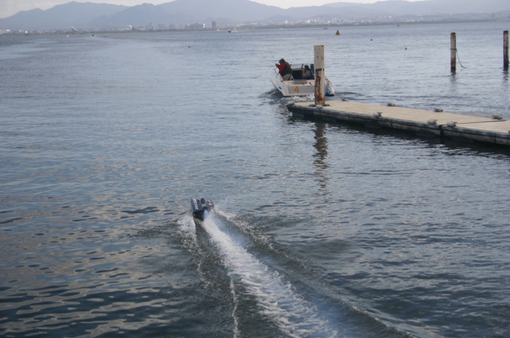 | 大木艇レースを如何にチャレンジするか | チタンのブラケットに7075の5軸削り出しプロペラ、この削り出しプロペラはレース後もびくともせず強靭さをアピールしました。 | 大木艇順調な滑り出し | 大木艇頑張って走っていきます。 | 段々と岸から見えなくなりました。 |