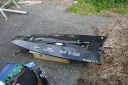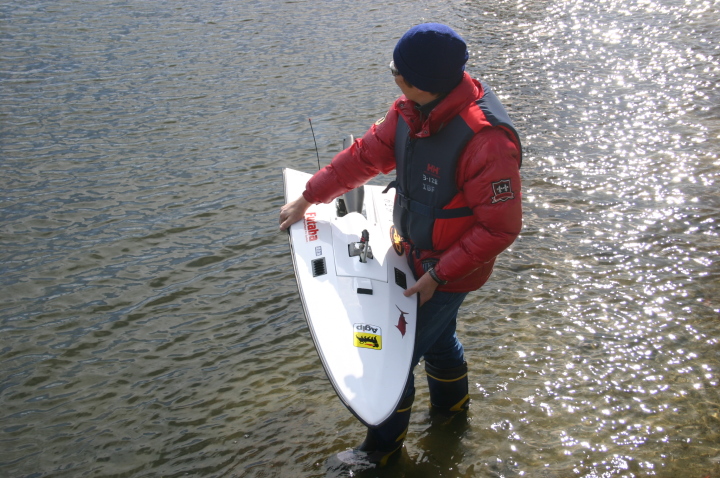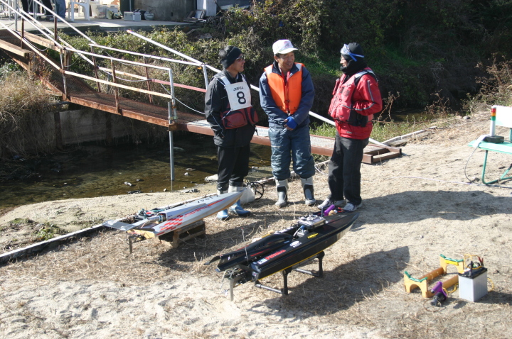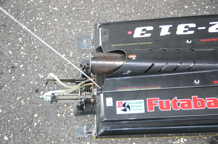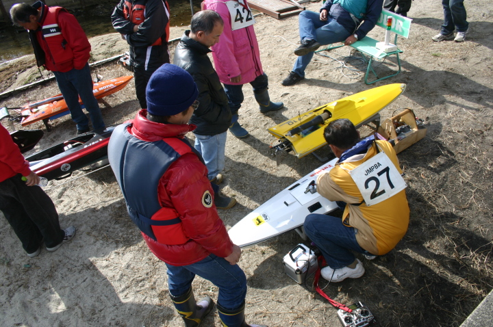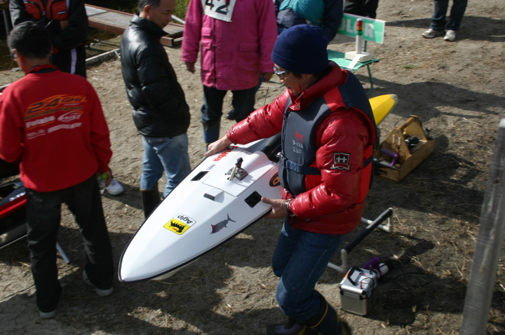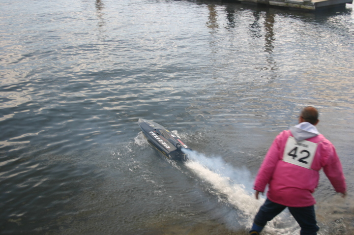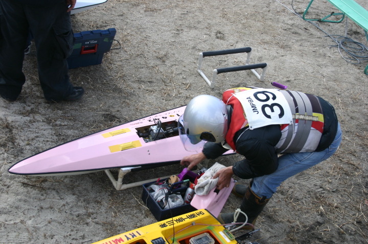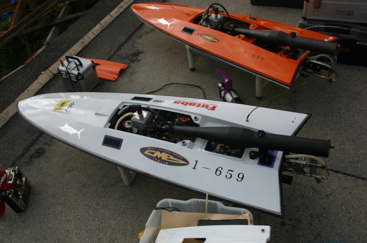 | GM級CMB35ccで優勝の迫口艇、迫口選手はただ一人リング無しのABCピストンで発売当初より使用しておられます。リング無し10%パワーアップするとのこと。 | 模型のGasolineエンジンでリング無しを作っているのは今のところCMBだけそれだけ性能に自信があります。リング無しは今のところ35ccのみです。 | CMB35cc搭載の沖田艇 | 白い方はCMB30cc搭載 | 沖田艇今回はうまく波に乗れず。 |