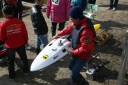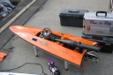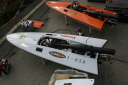 | 粟生艇如何なるレ−スに挑むか | ここから粟生艇が出走します。 | 今回惜しくも2位になったCMB30cc搭載の大木艇 | 大木艇手、芦ノ湖の勢いを持ってNew エンジンで! | HP-5D 70-1.8の超々ジュラルミン製(7075)ペラで80-90kmの速度を確保 |