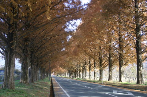 | 琵琶湖マリーナーから1時間半ほどゆくと「新日本街路樹百景」にも選ばれている メタセコイア並木があります。2日の日曜日には各地からこの並木をお目当てに カメラマンが多数押しかけてきていて駐車場は一杯でした。マキノピックランドの 果樹園にあるメタセコイア並木。約2.4kmに及び整備された並木道はどの季節に 訪れても美しい風景が楽しめる。特に冬の雪に覆われたメタセコイアは実物は 見ておりませんが写真で見る限り幻想的で私にとっては最高の景色に思え ました。メタセコイアの樹木は大阪でも見ることはありますがこの街路樹の様に 両脇に真っ直ぐ続いていると圧巻です。 |