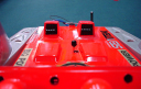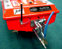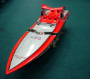 | 塗装は蛍光REDとシルバーでまとめました。 | カーボンをワンプライ入れました。FRP製になりましたので3.5ccエンジンが最適です。 | スケール艇のムードがでてきました。 | オリジナルブラケットホルダーを使用しております。間もなく発売予定です。 | ブラケットは4mmワイヤー用を使用しております。 |