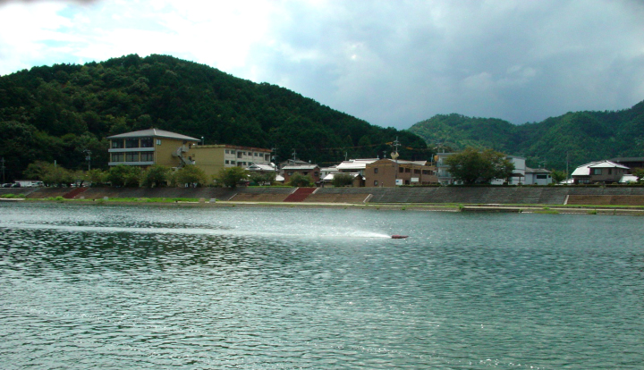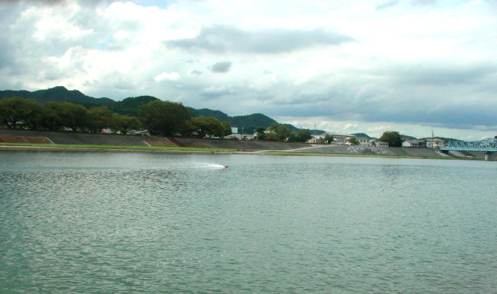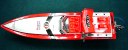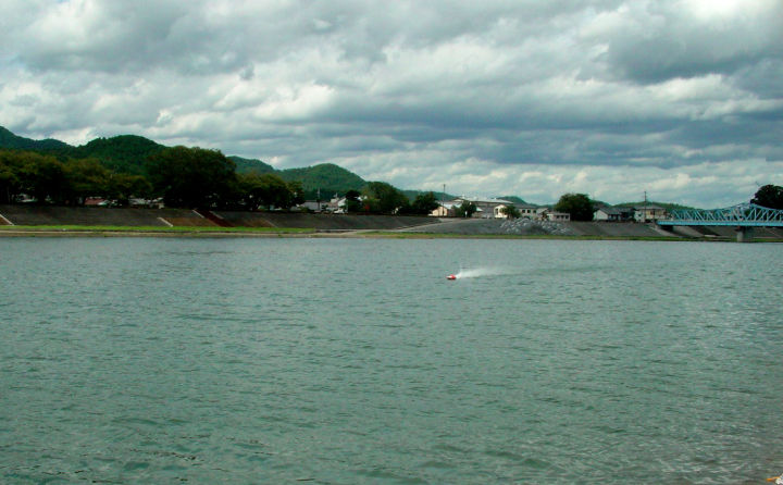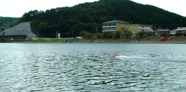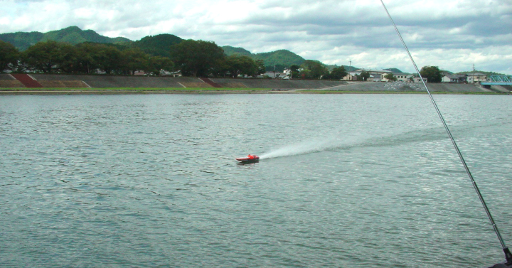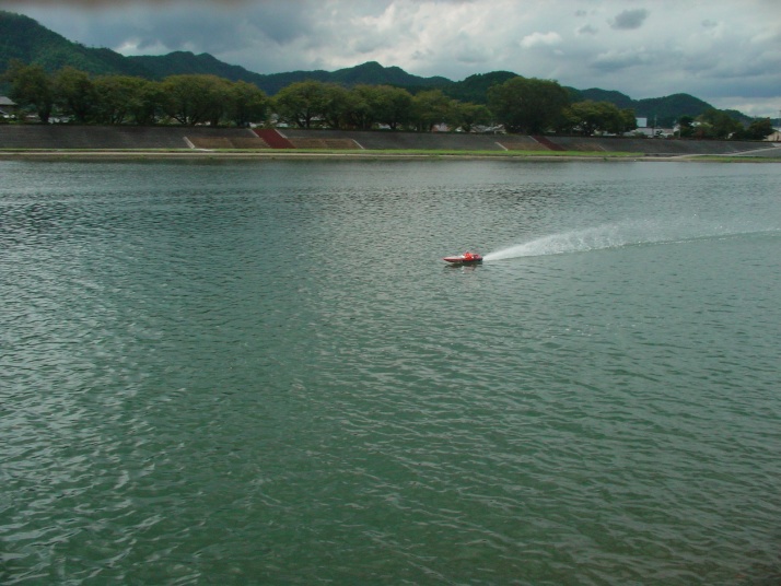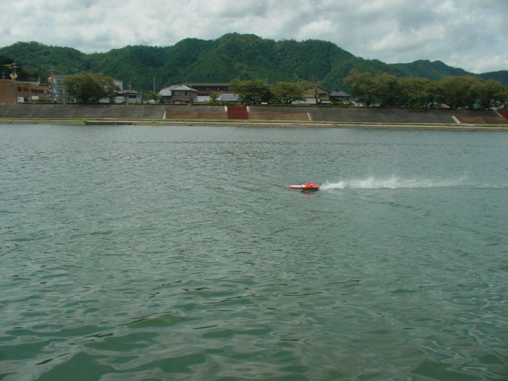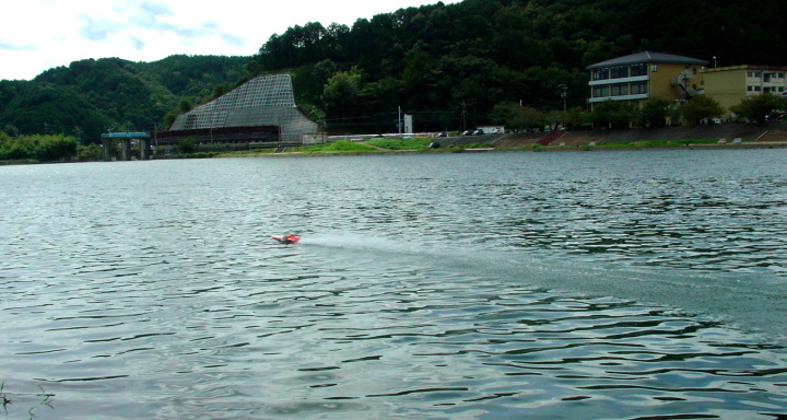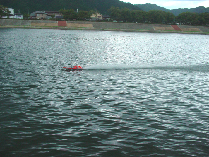 | RED-MAX40%の燃料を使用しPlugはNovarossi 6 | 少しずつニ-ドルを絞りながら走行状態見ます。 | ブラケットは船底に対して並行にする。船首上げをさせない為。 | テストを終わりの時に非常に強い風と波がきましたので強行しましたところご覧のように素晴らしい走行が出来ました。 | 今回使用したパ-ツセツトはBIG-HOBBYの特製のパ-ツで間もなく発売致します。 |