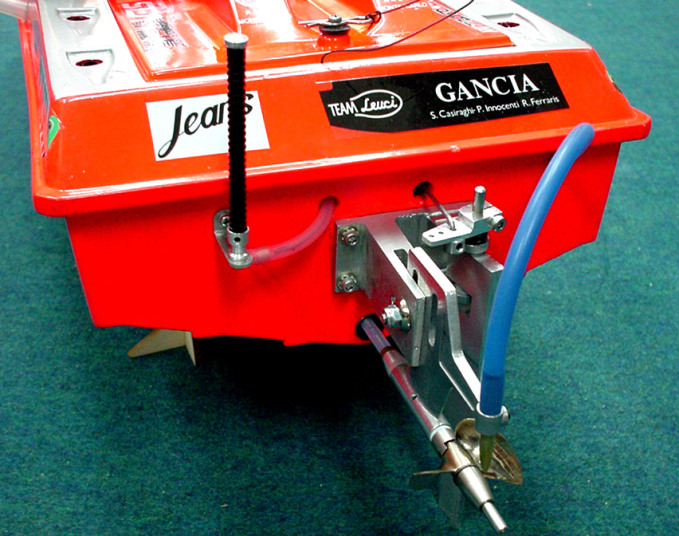 | T.T.21-Nova21用フローティングマウント。オプションパーツです。 | OS18用フローティングマウント。オプションあり。 | テスト当日、左より風と波が吹き寄せておりご覧のような状態でした。 | テスト開始スクリウを42x1.4JGを使用しましたが少し大きくX440/3に変えましたところ素晴らしくプレ-ンをしながら快走しました。ル-スターの出方で良くわかります。 | 当日は大変波と風が強くアメリカのレ-ス艇では少し無理ですが全長1mを越えるGanciaは喫水線が深くこの様な波を好みます。 |