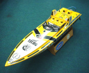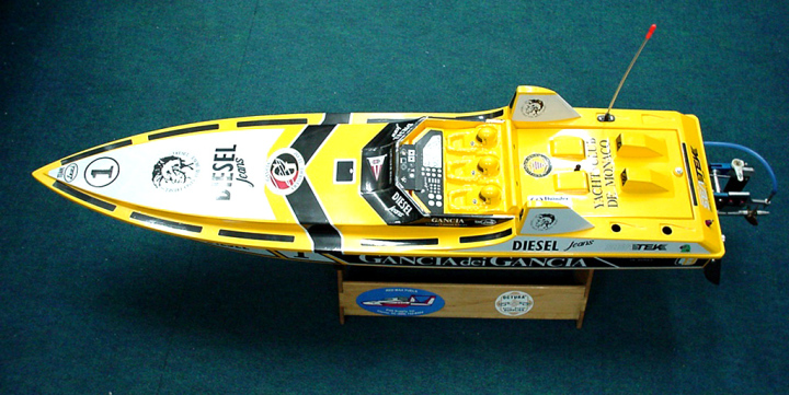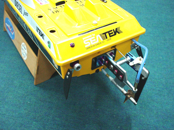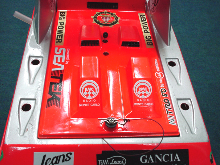 | 注意その他 | この船体は長く大きいので平水時の走行は非常に難しいので重心位置を後方にもってくることとブラケットをマイナス(2〜3度)にしウイングを後下がりのセッティングにすればなおよく走るようになると思います。ウイングのテストをまだ行っていませんが次回してみたいと思っております。キットの状態の時に木部その他内部にクリッパー製のFRP補修液などを必ず塗っておくことをお勧めします。この作業はラジコンボート(エンジン)をする人なら基本中の基本です。 |