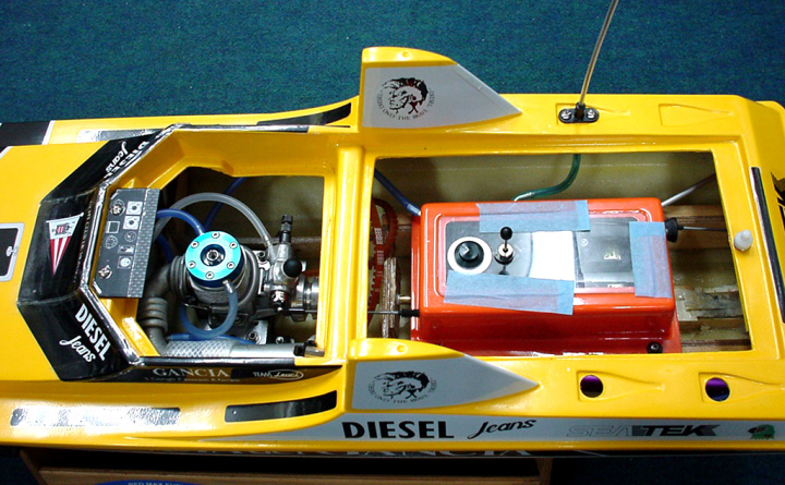 | 内部の温度が高温になりますので冷気を入れる為にベンチューリーを作ります。7ヶ所見えます。 | 内部の温度が高温になりますので冷気を入れる為にベンチューリーを作ります。5ヶ所見えます。 | メカBoxとエンジンマウントのレイアウト。ベンチューリーは15ヶ所開けました。 | Rossi21 Car用マフラーを使用船内にコンパクトに納まりスケール感がよくでています。 | イエローカラーも素敵です。貴方のお好きなカラーリングに挑戦してみて下さい。 |