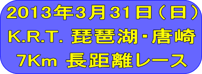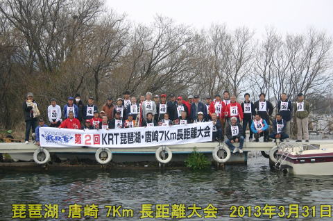 2013年3月31日大津市の唐崎マリーナにおいて昨年に続き第2回KRT(唐崎レーシングチーム)主催による琵琶湖・唐崎 7Km長距離大会が行われた。KRTの水原会長はじめメンバーの皆さんは昨年より少しは余裕が出来たのでしょうか?それでも色々な準備がありますので練習もそこそこに大会になりご苦労さまでした。若い?皆様のお力で今後も第3回第4回と続いていくことを願っております。秋の9月には第3回の大会が行われると聞いております。今回は3月31日と経営者もお勤めの方も決算とだぶり練習もそこそこにという方や忙しくてエントリー出来ないという方までさまざまでした。秋9月の大会には沢山のエントリーのお申し込みをお待ちしております。後援、ご協賛いただいた皆様にはこのページにて御礼申し上げますと共に今後もご指導ご鞭撻のほどよろしく、お願い申し上げます。今回レースに参加していただいた方は勿論、ラジコンボートに興味のある方このページにて当日を思い出してお楽しみ下さい。