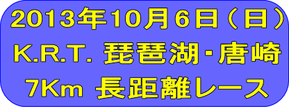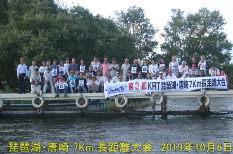 2013年10月6日大津市の唐崎マリナーにおいて今年の3月に続き第3回KRT(唐崎レーシングチーム)主催による琵琶湖・唐崎7Km長距離大会が行われた。前日の土曜日は台風の影響で曇っており日曜日の天候が心配されましたが日頃の皆様の行いが良かったのかどうかわかりませんが10月にしては何十年振りの真夏日で関西圏は軒並み30度越えで予想外の暑さに嬉しさ半分もっと薄着をしてきたら良かったと人間とはなんと身勝手なものでしょうか?水面も長距離レースでは申し分のない良い状態でした。水原会長並びにKRTの皆様色々とお世話になりありがとうございました。少々気が早いですが来年の大会もよろしくお願い致します。(選手一同)