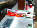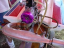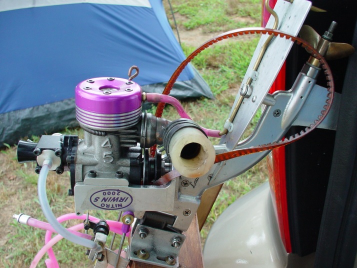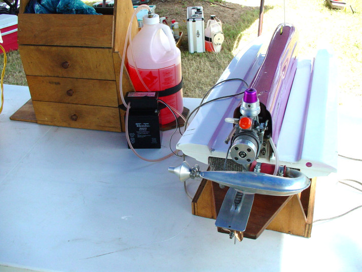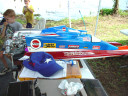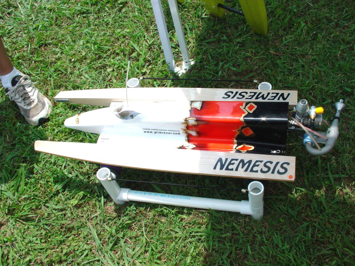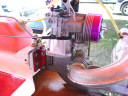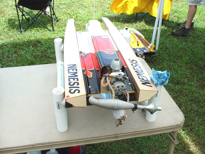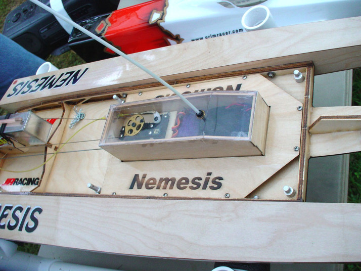 | Nemesisの完成 | Nemesisのカウルはクリアになっています。 | Mr. mikeのケーブルリンケージは円形のホーンを重ねてケーブルを通して両引きにする。 | トランサムから見たエンジン部FRP製とは叉違うデザインになっています。 | VS-1もこの機構で構成されています。 |