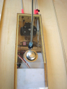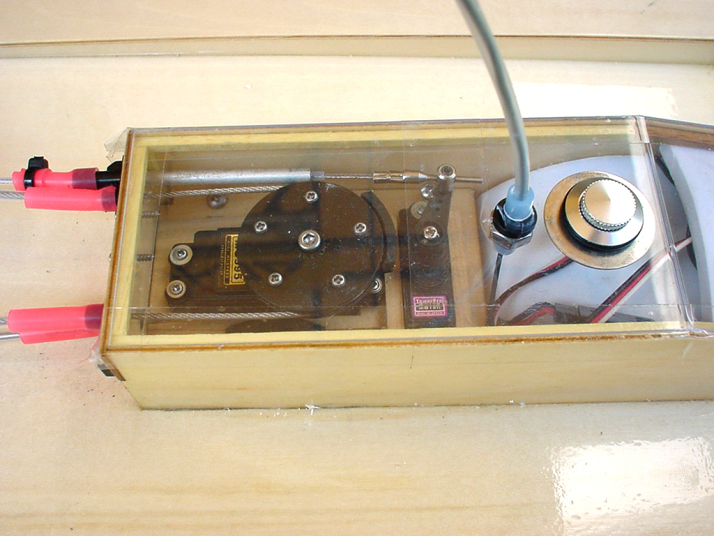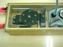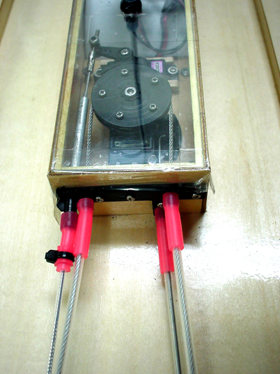 | 重心位置はトランサムより15cmの所にあります。全て搭載済みで全備重量2.4Kg今回テストに使用したエンジンはT.Tiger21船外エンジン | メーカーより付属している円盤とプロポに付属している円盤型のサーボホーンとを上下に5本のビスで組上げれば完成します。 | 完成された円盤ホーンに付属のワイヤーをキンクして両サイドに出してきます。 | 出し口はエンジンステアリングワイヤーロッド2本もう1本はエンコンワイヤー用、出口には付属しているプラスティックのアタッチメントからそれぞれ3本出してエンコンはエンコンサーボにリンケージし、エンジンリンケージはステアリングサーボにリンケージします。これでスムースに動くようになります。 | ステアリングロッド用のサーボは7kg以上のトルクのあるサーボを使用して下さい。 |