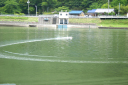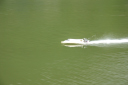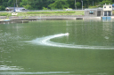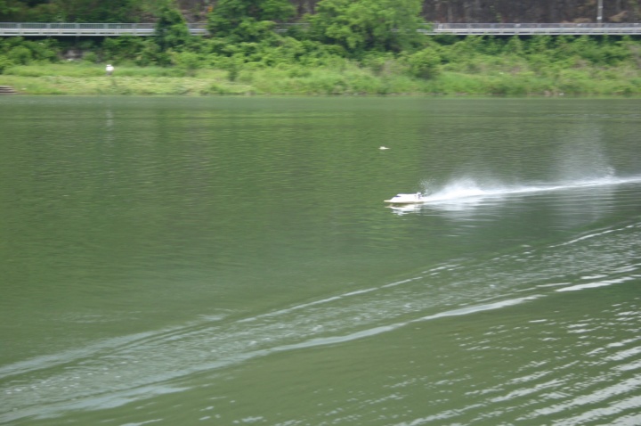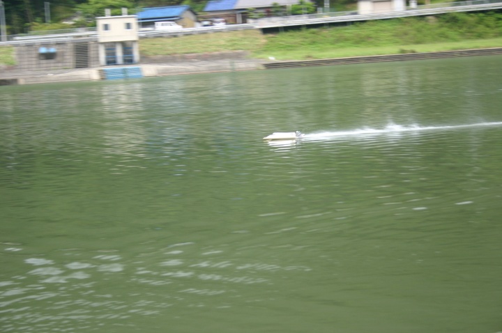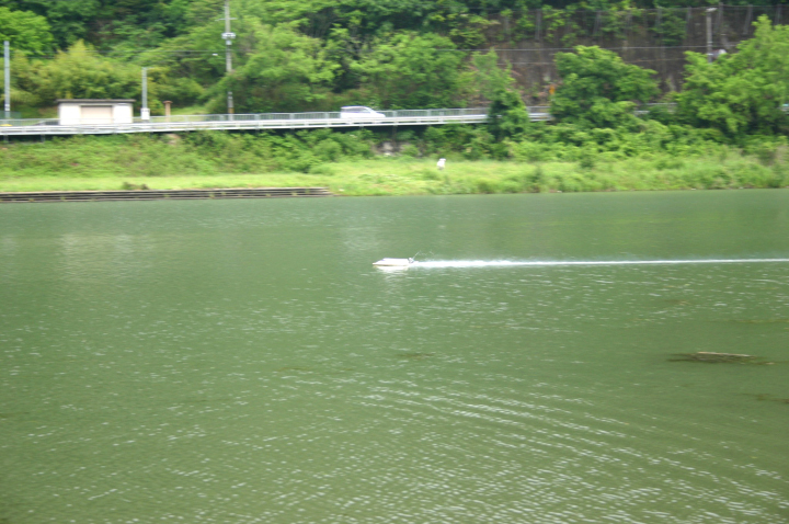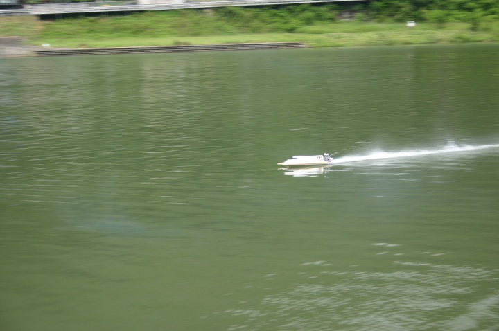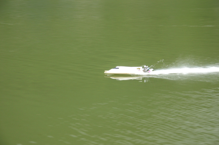 | 当日は無風のベタの水面でした。 | 使用したプロペラはOctura Y536 | 画像の様にルースターは後方に低く長く出るのが良いのです。 | テストは直線がスムースに加速するのに重点をおいています。 | 中スロットルからハイまで船の姿勢が変らないか慎重に加速していきます。 |