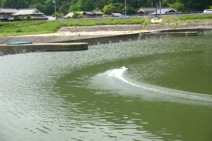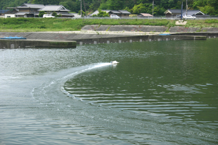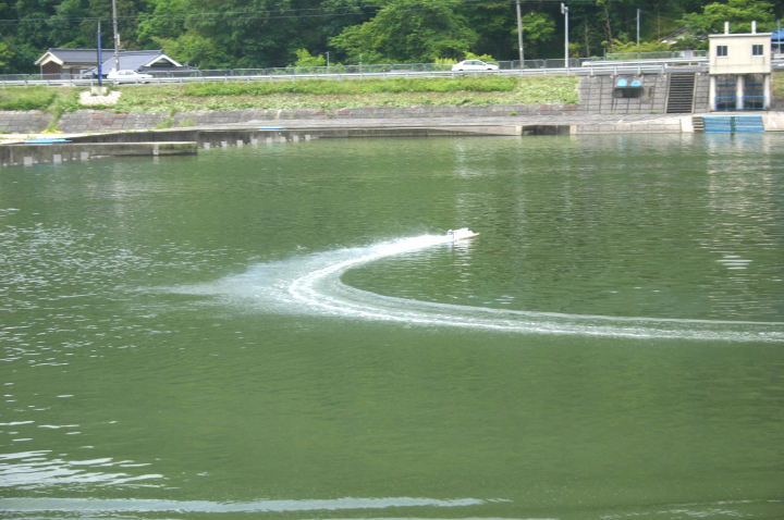 | 全速で大きなカーブを | 少しずつ小さく小さく廻っていきます。 | 突っ込みや引っ掛かりがないか何回も修正してゆきます。 | 今回は少し船首が前下がり気味だったのでクイックに廻りました。 | 直線は少し船首を上げる調整をして速度がのびるように再度セッティングを変えます。 |