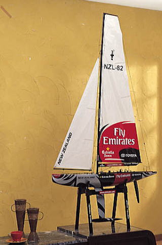 ニュージーランドのEmirates Teamのアメリカズ カップレーシングヨットです。延べ20,000人- 時間と6ヶ月を費やして2007年のレガッタに 向けて建造されたものです。 サンダータイガーはこのヨットをETNZの公式 ライセンス取得し1mモデルとして完成させま した。工場で組立塗装し完成されたABS製船体 、高性能レーシングセール、軽量押出アルミ製 のマストとブーム、水力抗力の少ないスチール製 バラストで構成されています。 レースを終えたら部屋のデコレーションとして 見栄えのある船艇です。このキットにはメンテ ナンスや展示に便利な黒色アルマイト着色の アルミ製スタンドも付属しています 品番----------------5555 全長----------------993mm マスト高------------1306mm 全高---------------1700mm 重量----------------3.5kg RC装置-------------2チャンネル2サーボ 標準税込価格----------\34,800→製造中止 |